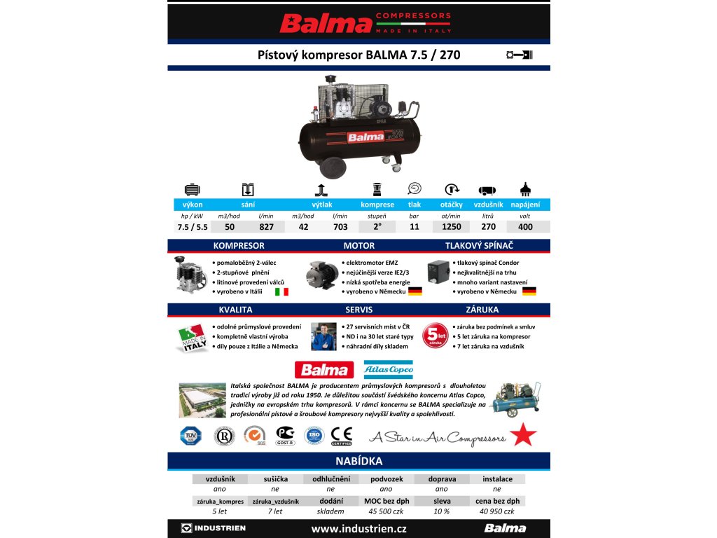 Dvouválcový řadový vzduchový kompresor Balma pro dodávky stlačeného vzduchu je spolehlivý stroj nejvyšší kvality s jedinečnou 5 letou zárukou. Při jeho výrobě je použito pouze těch nejlepších italských a německých komponentů. Základem je silný německý elektromotor EMZ o výkonu 10 hp / 7,5 kW při napájení 400/380 V. Společně se vzdušníkem o objemu 270 litrů zaručují široký rozsah dílenského použití, díky kompaktnímu designu si zachovává malé zástavbové rozměry a ve spojení s pevným madlem a 4 stabilními bržděnými pojezdovými kolečky i snadnou mobilitu. Konstrukce s litinovým provedením válců a zejména převodem točivého momentu řemenem mezi elektromotorem a kompresorem výrazně snižuje otáčky kompresorové jednotky a tím zásadně snižuje její opotřebení. Řadí se tak do kategorie PROFESIONAL a je možné na něj poskytovat dlouhou záruku. Stroj je doplněn velmi kvalitním patkovým elektromotorem s ochranou proti přetížení a integrovaným rozměrným ventilátorem pro ideální chlazení. Součástí vzduchového kompresoru BALMA je nejkvalitnější tlakový spínač od německé značky CONDOR nastavitelný až do 11 bar, díky čemuž je vhodný i pro nákladní pneuservis (spínání nad 9 bar). Zajišťuje plně automatický chod stroje a je navíc unikátní svou možností dvojitého nastavení spínacího tlaku a jeho rozsahu. Kompresor je také vybaven rozměrným dochlazovačem stlačeného vzduchu, který zásadně snižuje jeho teplotu a tím jeho tendenci absorbovat vzdušnou vlhkost, která pak se vzduchem putuje do pneumatických strojů či nářadí. Pro kontrolu tlaku je tento pístový kompresor vybaven 2 tlakoměry a pro odběr stlačeného vzduchu je připraven tlakový regulační ventil a 2 samostatné rychlospojky. Vzduchový kompresor Balma je z výroby již naplněn velmi kvalitním kompresorovým olejem Shell, dodáván včetně veškerých protokolů, osvědčení a pasportů pro český trh. Na výrobky značky BALMA je poskytována 5 letá plná záruka + prodloužená 7 letá záruka na vzdušník. Kompresor je možné doplnit kondenzační sušičkou vzduchu. Součástí je široká servisní síť u desítek partnerů v celé České republice a veškeré náhradní díly skladem. Pro případné dotazy navštivte naši PORADNU: Jak vybrat kompresor nebo nás neváhejte kontaktovat.