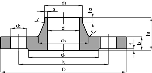 | DN25 | 33,7 mm | 115 mm | 18 mm | 85 mm | 40 mm | 46 mm | 2,6 mm | 4 mm | 6 mm | 68 mm | 2 mm | 14 mm | 4 | EN 1092-1 |